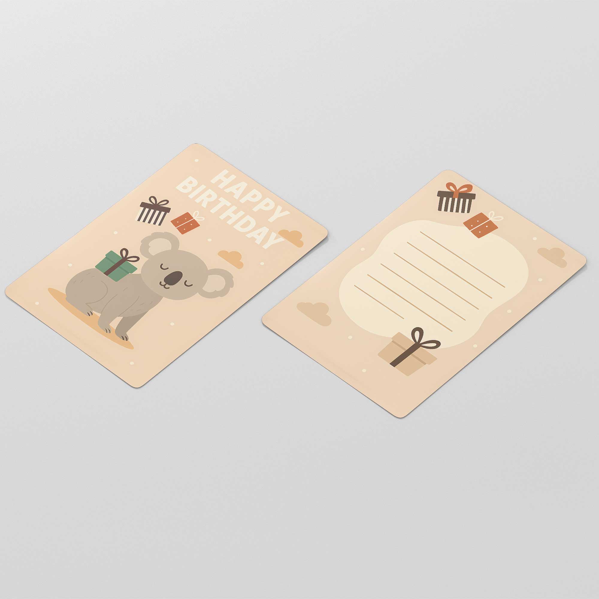 Manchmal ist es die Ruhe, die am meisten berührt – und genau das strahlt dieser süße Koala aus. Mit geschlossenen Augen, einem sanften Lächeln und kleinen Geschenken auf dem Rücken begrüßt er Geburtstagskinder auf eine ganz besonders liebevolle Art. Die zarte Farbgebung in Beige und Creme unterstreicht die ruhige Ausstrahlung dieser Karte – ideal für Jungen und Mädchen, die Tiere lieben oder einfach ein Herz für besondere Details haben.