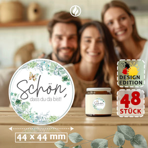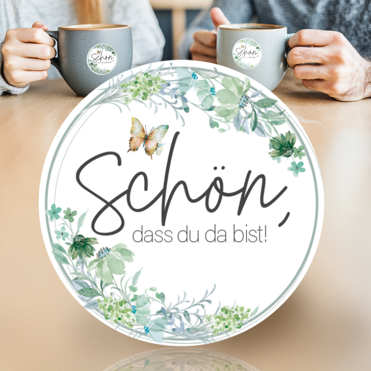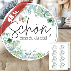 48 Aufkleber Rund Schön dass du da bist, Floral Butterfly Salbeigrün