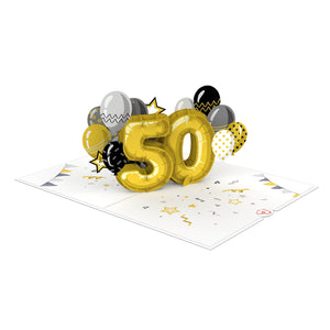 Beim Öffnen dieser besonderen Pop-Up-Karte entfaltet sich eine stilvolle „50“, umgeben von eleganten Luftballons und glänzenden Sternen. Der Boden ist mit schimmerndem Konfetti verziert, das der Karte einen festlichen Glanz verleiht. Diese Karte ist ein großartiges Geschenk für den 50. Geburtstag und sorgt für eine unvergessliche Überraschung. Sie schafft einen magischen Moment und lässt das Herz des Geburtstagskindes garantiert höherschlagen.
