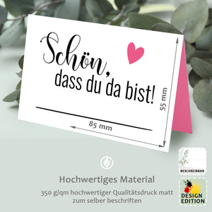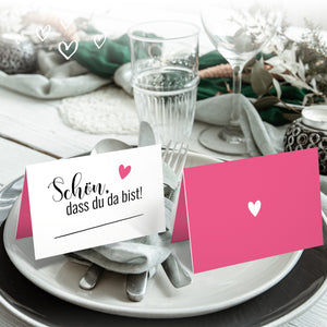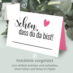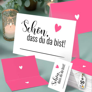 50 Tischkarten „Schön, dass du da bist“ – Platzkarten mit pinkem Herzmotiv
