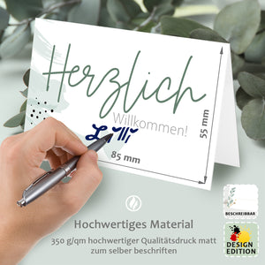 Gefertigt aus stabilem 350g Offsetkarton, bieten die Karten eine edle, matte Oberfläche, die sich leicht beschriften lässt – ideal zum Personalisieren mit Namen oder individuellen Botschaften. So schaffen Sie charmante Willkommenskarten, die perfekt mit verschiedensten Tischdekorationen harmonieren und als Dekorhighlight funktionieren.