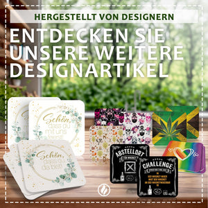 Die Karten sind in vier stilvollen Farben erhältlich: Braun, Grün, Grau und Lila. Die dezente Rückseitengestaltung mit Herzmotiven macht sie auch von hinten zum Blickfang. Eine vorgedruckte Linie bietet Platz für handschriftliche Namenseinträge – so wird jede Karte zum kleinen Unikat.