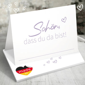 50 Tischkarten „Schön, dass du da bist!“ – in Braun, Grün, Grau oder Lila