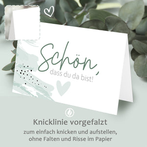 Ideal für Tischkarte Hochzeit mintgrün, Platzkarten modern, Sitzkarten Schön dass du da bist, Namenskarten zur Taufe, Tischkarten grün minimalistisch und Gastgeschenke Hochzeit Papeterie.