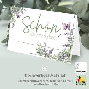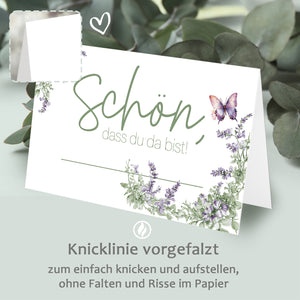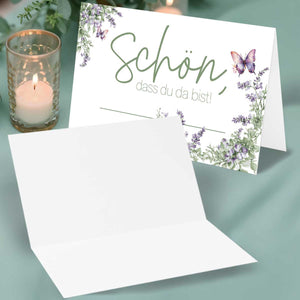 Begrüßen Sie Ihre Gäste stilvoll mit 50 floralen Tischkarten """"Schön, dass du da bist"""" in Lavendelgrün! Das liebevoll designte Butterfly-Motiv mit zarten Lavendelzweigen und einem pastellfarbenen Schmetterling zaubert auf jeder Feier eine natürliche, herzliche Atmosphäre. Die eleganten Klappkarten sorgen dank stabiler Faltung für einen sicheren Stand – ob auf Holztisch, Leinentuch oder als Teil der Vintage-Hochzeitsdeko.