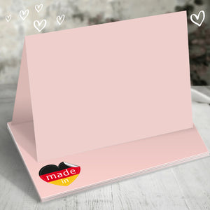 Das rechteckige Format (8,5 x 5,6 cm, 8,5 x 11,2 cm offen) und die beidseitige Vollfarbe in Pastellrosa eröffnen grenzenlose Gestaltungsmöglichkeiten: ob als Kreativ-Tischkarte, Buffet-Schild oder Namensschild – ganz nach Ihren Wünschen individualisierbar. Die zurückhaltende Rosatönung sorgt für eine stimmungsvolle und liebevolle Atmosphäre, passend zu klassischer, moderner oder Vintage-Deko.