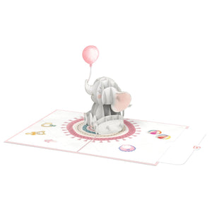 Juhu, das Baby ist da! Beim Öffnen dieser süßen Geburtskarte entfaltet sich ein kleiner, niedlicher Elefant. Er heißt das neue Baby willkommen und hält zur Begrüßung einen rosa Ballon in die Höhe. Das Elefantenbaby sitzt auf einer kuscheligen Spieldecke, umgeben von Schnuller, Rassel, Lätzchen und bunten Bällen.