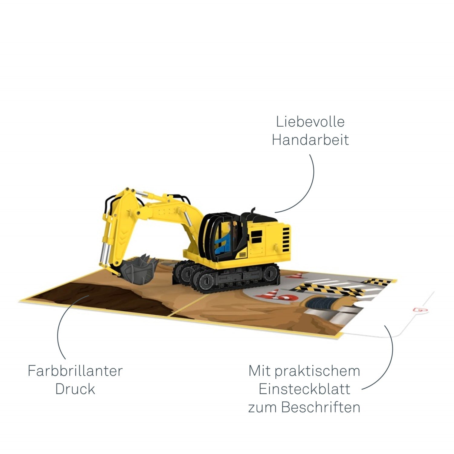 Über diese besondere Pop Up Karte freuen sich Baggerfreunde jedes Alters! Die Baggerkarte wird gerne als Geburtstagskarte für Kinder verschenkt oder auch als lustige Geschenkkarte für Männer.