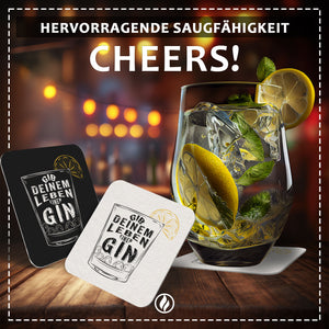 Jeder Bierdeckel trägt das geistreiche Motto "Gib deinem Leben einen Gin", ein cleveres Wortspiel, das jede Gin-Runde aufheitert.