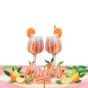 Verschenke Lebensfreude pur mit dieser stilvollen Pop-Up Karte! Beim Öffnen entfalten sich zwei Aperol-Gläser, die fröhlich miteinander anstoßen. Dekoriert mit Orangenscheiben und Strohhalmen, verbreiten sie pure Sommerstimmung. Der schwungvolle „Cheers“-Schriftzug rundet die Szene perfekt ab, während saftige Orangen mit grünen Blättern das Design harmonisch ergänzen. Die warmen Pink- und Rosatöne verleihen der Karte eine besonders frische und elegante Ausstrahlung. Das Cover ist passend mit einem stilisierten Aperol-Glas und einer Orangenscheibe gestaltet und macht sofort Lust auf eine spritzige Auszeit.