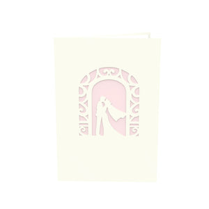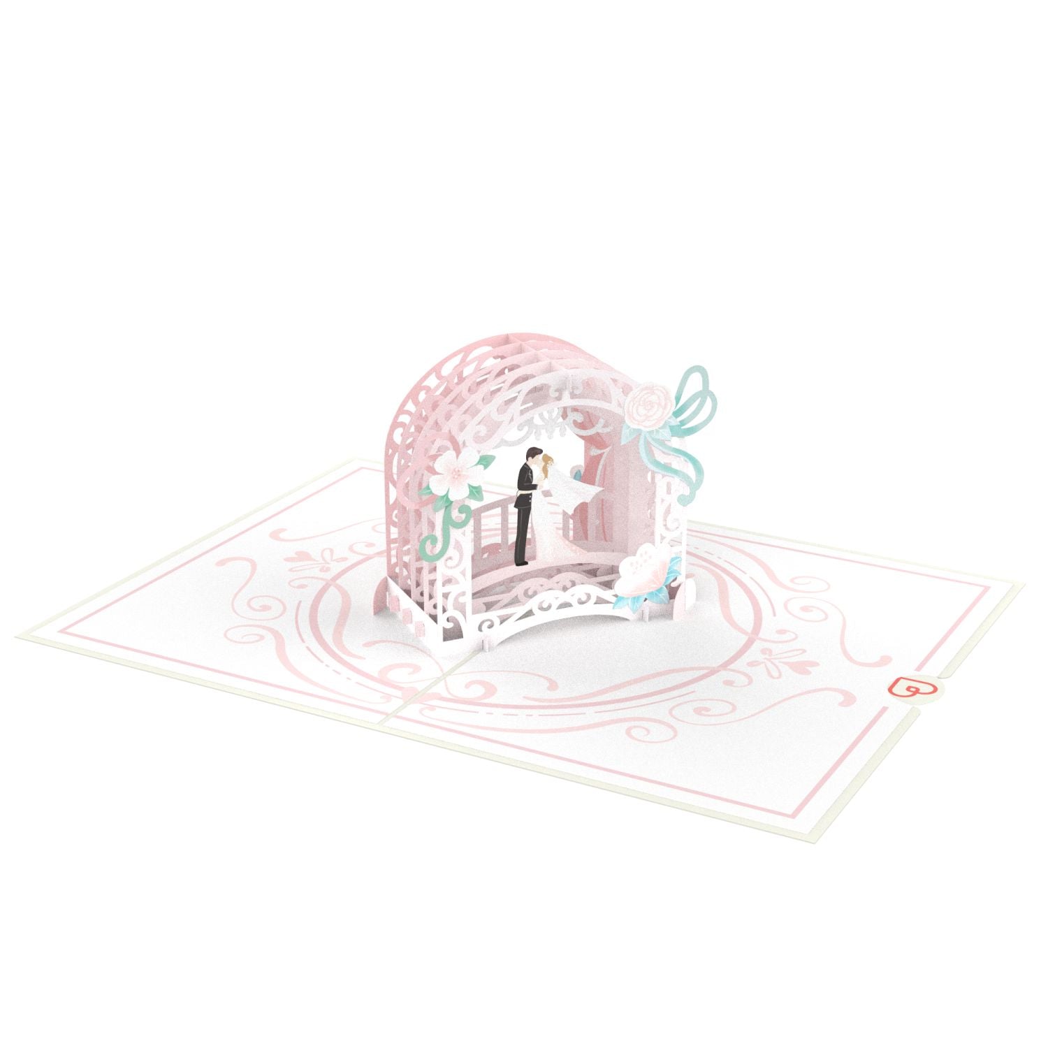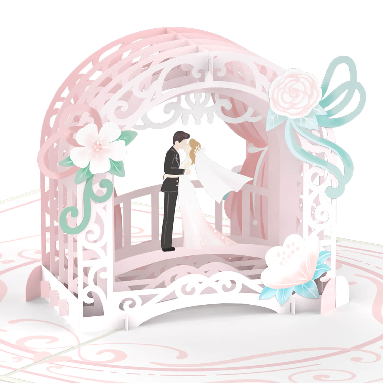 Überrasche das Brautpaar mit einer ganz besonderen Hochzeitskarte zu ihrem ganz besonderen Tag. Beim Öffnen dieser zauberhaften 3D-Karte entfaltet sich ein wunderschöner Hochzeitsbogen, unter dem das frisch vermählte Brautpaar Hand in Hand in die gemeinsame Zukunft schreitet. Die romantischen Farben und filigranen Details lassen die Glückwunschkarte besonders edel und hochwertig wirken. Der Schleier der Braut weht sanft im Wind und verleiht der Szene eine verträumte Leichtigkeit.