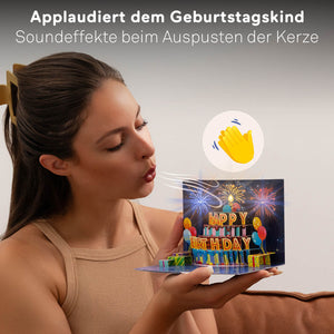 „Happy Birthday to youuu...” – Sobald man diese kunterbunte Geburtstagskarte öffnet, geht die Party los! Die große Geburtstagstorte in der Mitte leuchtet bunt auf, während das bekannte Geburtstagslied spielt. Und das Beste: Wenn das Geburtstagskind die kleine Kerze auspustet, geht die Flamme aus und es gibt lauten, fröhlichen Applaus – wie bei einer richtigen Geburtstagsparty!