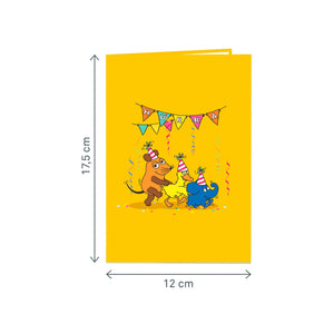 Beim Öffnen der Karte entfalten sich Maus, Elefant und Ente bei einer lustigen Geburtstagspolonaise. Mit Partyhüten auf dem Kopf tanzen die drei Freunde freudig in einer Reihe. Die Innenseite der Karte ist mit einer bunten Girlande mit dem Schriftzug "Herzlichen Glückwunsch" und kunterbuntem Konfetti geschmückt. Ein großes Geburtstagsgeschenk mit roter Schleife rundet die Geburtstagsfeier ab.