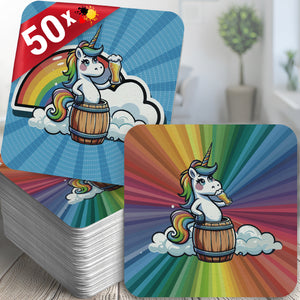 Auf einer Seite ein entspanntes Einhorn auf Wolken, auf der anderen Seite ein Einhorn inmitten eines strahlenden Regenbogens – diese Bierdeckel versprechen eine Reise in das Reich der Fantasie und Faszination.
