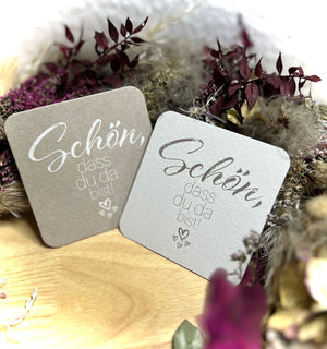 Diese Bierdeckel sind perfekt als Bierdeckel schön dass du da bist, Untersetzer Gastgeschenk, Tischdeko Hochzeit, Bierdeckel mit Spruch, bierdeckel hochzeit deko, bierdeckel herzlich willkommen und gastgeschenke für Feierlichkeiten einsetzbar.