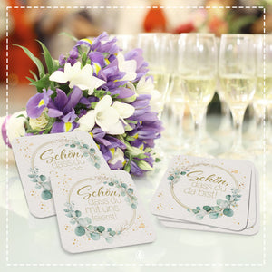 😍Motiv: Eukalyptus Floral - Schön, dass du da bist! und Schön, dass du mit uns feierst - beidseitg bedruckte Bierdeckel. Ideal für Hochzeiten, Geburtstage, Jubiläen oder jede Veranstaltung, bei der Sie Ihre Gäste willkommen heißen möchten.