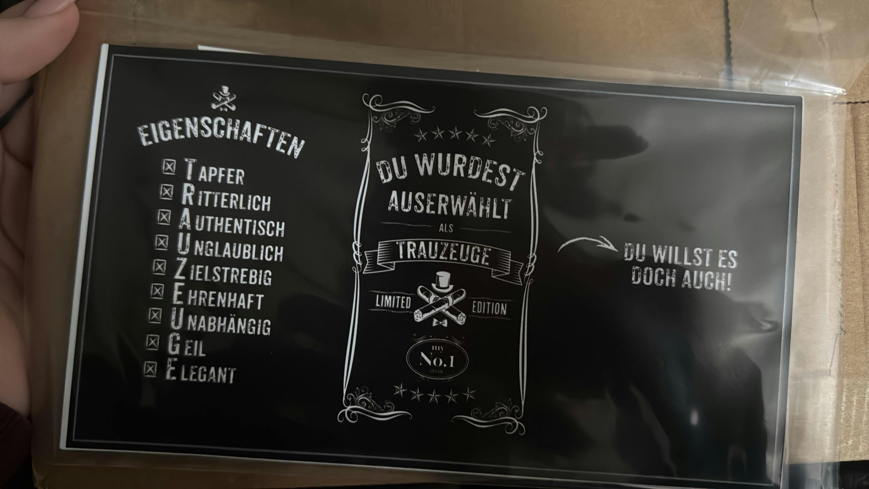 Wenn du deinen besten Freund zum Trauzeugen machen willst – mach es mit Stil. Unser hochwertiges Flaschenetikett „Willst du mein Trauzeuge sein?“ ist die perfekte Kombination aus Überraschung, Persönlichkeit und Männlichkeit. Statt großer Worte sprichst du mit dem, was wirklich zählt: einer guten Flasche und einer starken Botschaft.