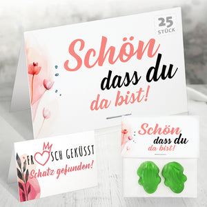 😍 Komplettes DIY Set: Du bekommst 25 hochwertige Karten im Design deiner Wahl und 25 selbstklebende Beutel zum einfachen Befüllen – z. B. mit Fruchtgummis, Mandeln oder kleinen Überraschungen.