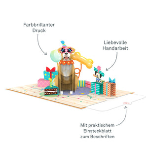 Unsere Pop-Up-Geburtstagskarte ist ein echtes Highlight für Hundeliebhaber jeden Alters! Sie eignet sich hervorragend als originelle Geburtstagskarte für Freunde, Familie oder Kollegen, die ihre Liebe zu Vierbeinern teilen. Ob für Kinder oder Erwachsene – dieses verspielte Design bringt garantiert ein Lächeln ins Gesicht.