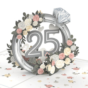 Du möchtest deinen Eltern, Großeltern oder Freunden ein unvergessliches Geschenk zur Silberhochzeit machen? Dann haben wir die perfekte Pop-Up Karte für dich! Beim Öffnen der 3D Karte entfaltet sich ein silberner Diamantring mit einer großen 25, der mit wunderschönen Rosen in Pastelltönen geschmückt ist. Die Innenseite der Karte ist ebenfalls mit Rosen und Herzen sowie einer zarten Bordüre am Kartenrand geschmückt und strahlt Eleganz und Liebe aus.