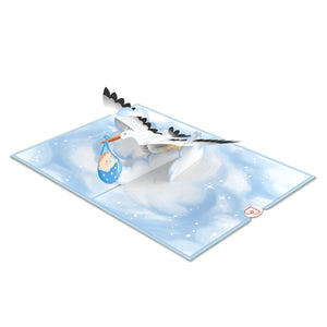 Hallo Baby! Hurra, das Baby ist das! Alles Gute zur Geburt! Herzlich Willkommen auf der Erde! Egal, was du den frisch gebackenen Eltern und ihrem Nachwuchs wünschen willst – mit unserer Baby Storch Karte bleibt es unvergessen. Beim Öffnen der Karte entfaltet sich der filigrane Storch mit blauem Babybündel im Schnabel. Er fliegt durch die Wolken und bringt den Eltern das neugeborene Baby.