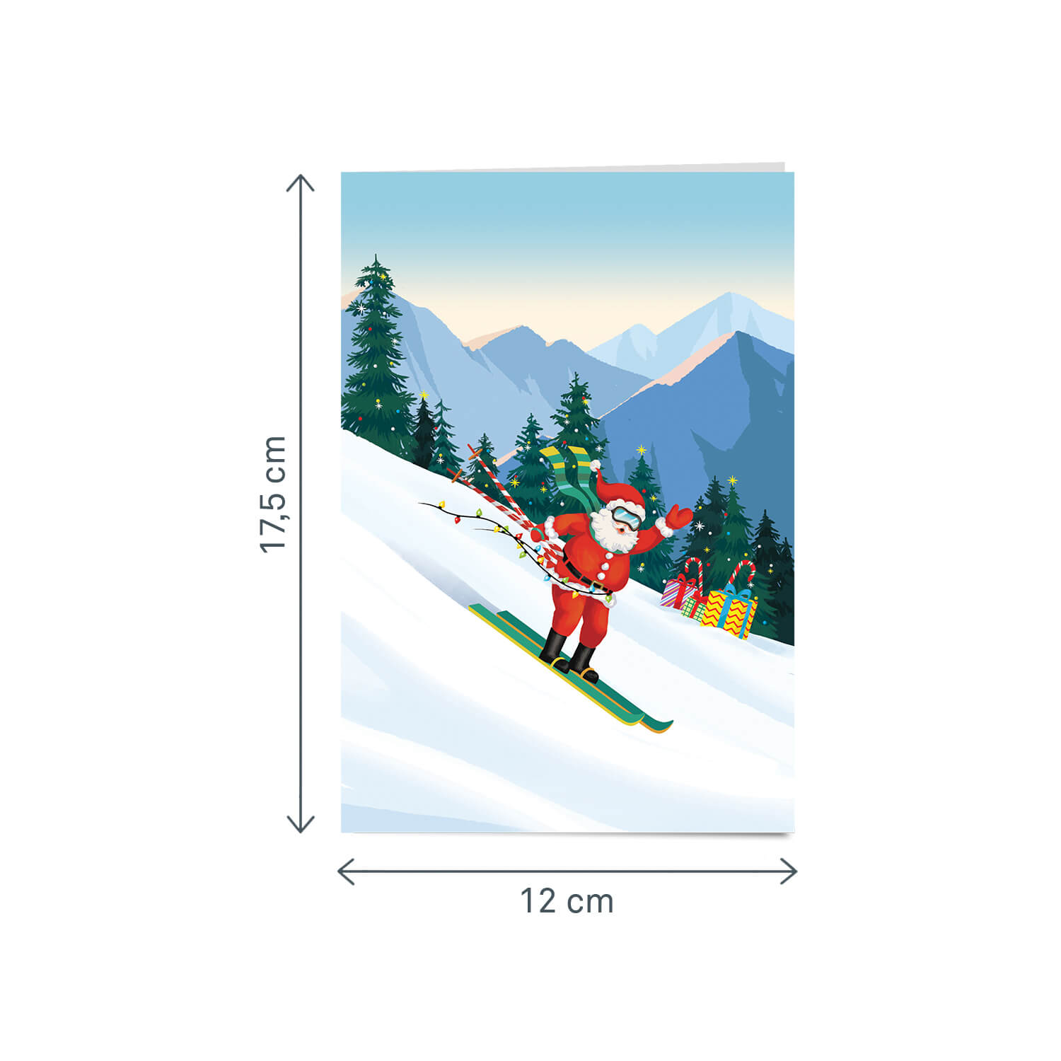 Das Cover der Geschenkkarte zeigt den fröhlichen Weihnachtsmann, wie er durch den Fahrtwind saust und den Berg hinunterfährt – ein Bild, das sofort ein Lächeln ins Gesicht zaubert!