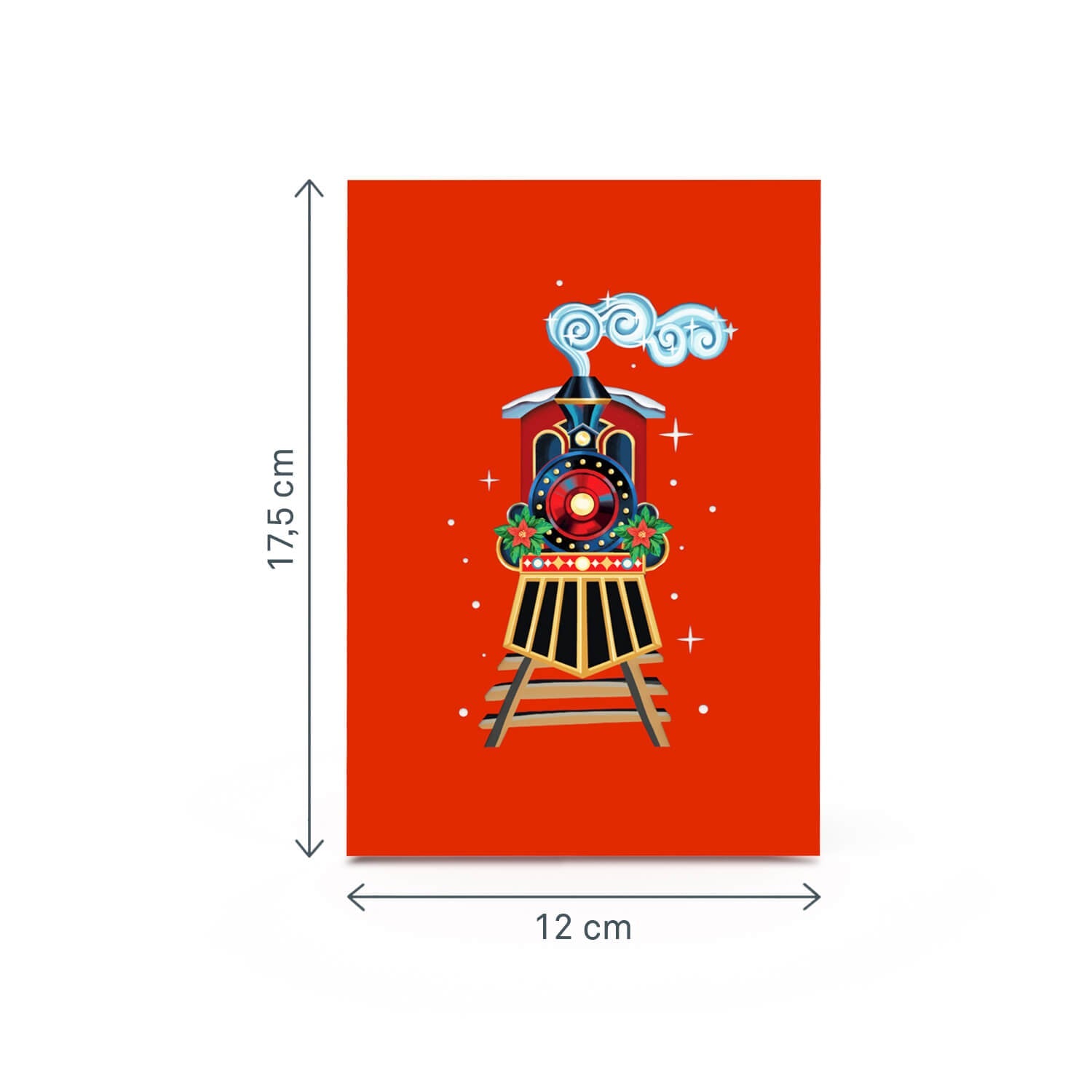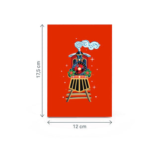 Das leuchtend rote Cover der Weihnachts-Grußkarte zeigt den Weihnachtszug in voller Fahrt, während aus dem Schornstein dekorativer Rauch emporsteigt, der die kalte Winterluft mit einem Hauch von Magie erfüllt.