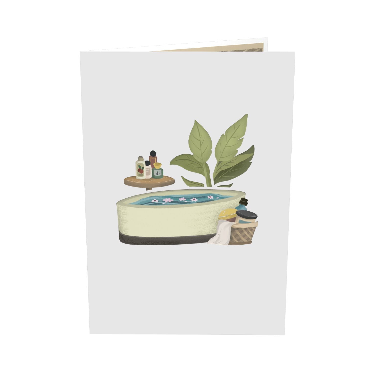 Erholung pur! Beim Öffnen dieser wunderschönen 3D Pop-Up Karte entfaltet sich eine wahre Wellness-Oase: Eine cremefarbene Badewanne befüllt mit einem Entspannungsbad mit Blüten, ein Spa-Set mit Pflegeprodukten, ein Hamamtuch, und exotische Pflanzen für die Wohlfühlatmosphäre. Das Cover der Karte ist in einem Weißton gehalten und zeigt ebenso die Badewanne mit Spa-Set.
