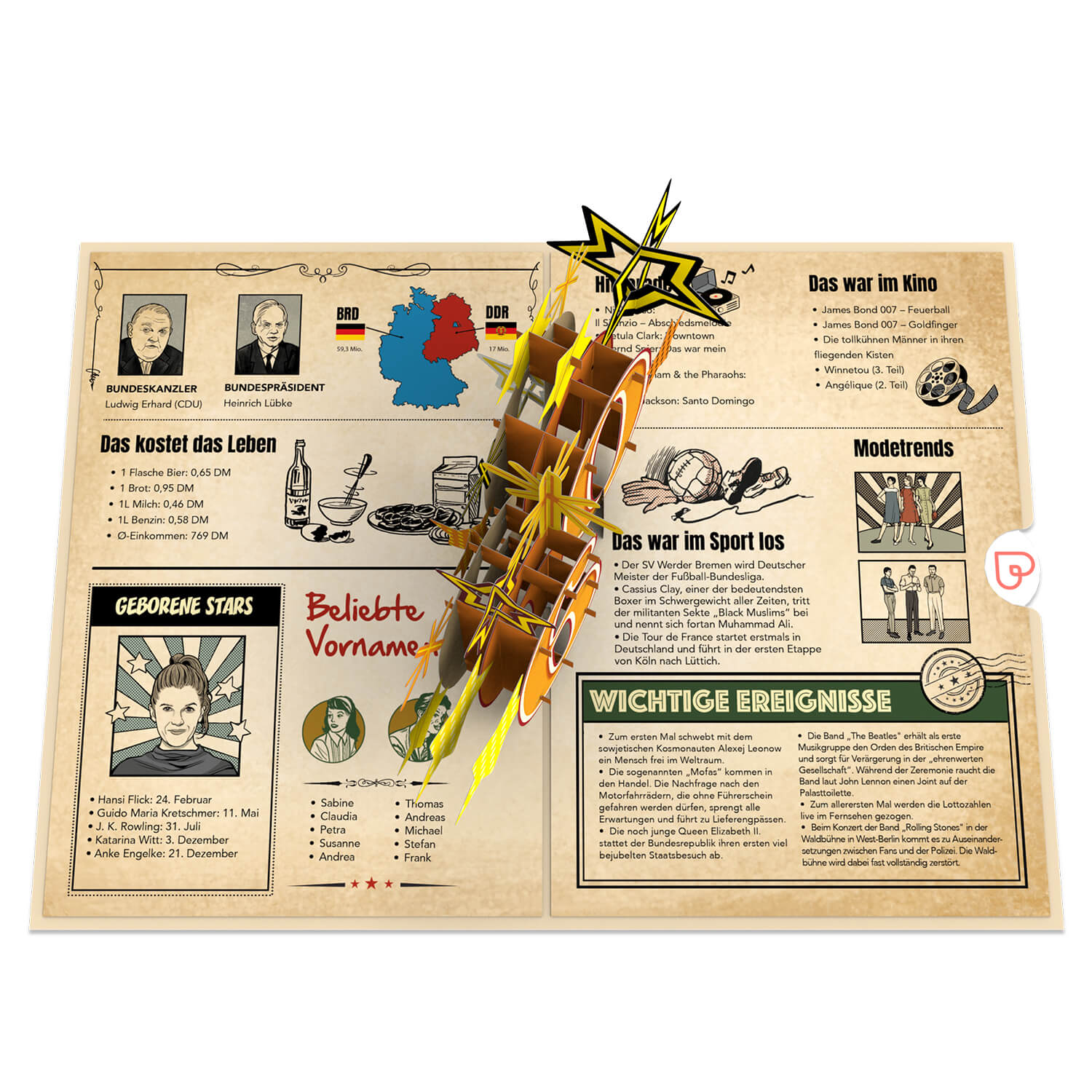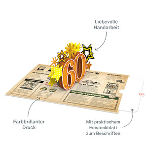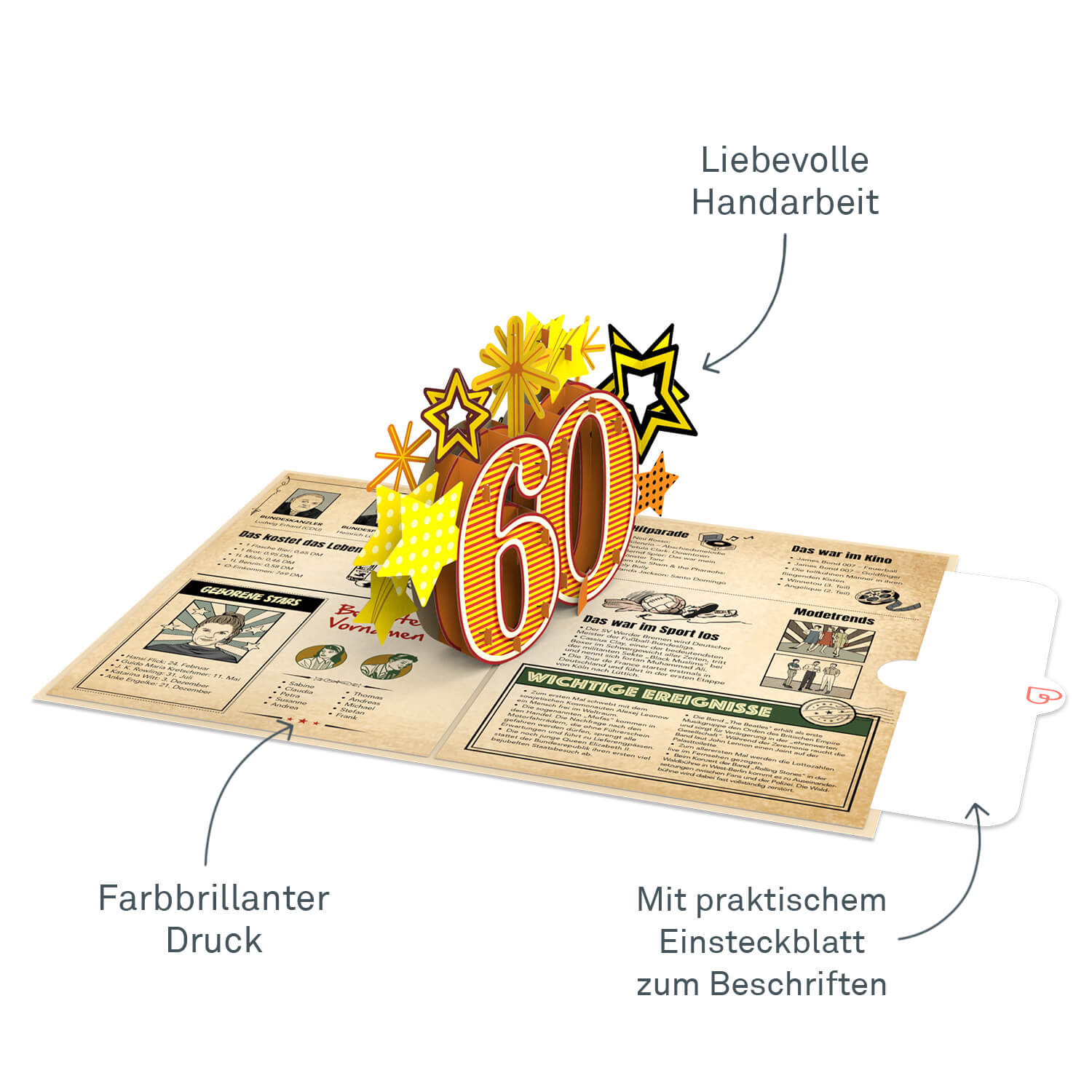 Entdecke die perfekte Überraschung für den runden Geburtstag: Unsere 3D Pop-Up Geburtstagskarte zum 60. Jubiläum! Diese einzigartige Klappkarte feiert das Geburtsjahr 1965 der Geburtstagskinder mit einer imposanten "60", die sich beim Öffnen der Karte entfaltet. Im Inneren der Karte warten interessante Fakten, charmante Anekdoten und witzige Informationen auf die Jubilare, die einen nostalgischen Rückblick in ihr Geburtsjahr ermöglichen.